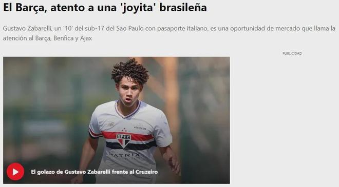 每日体育部消息,巴萨正持续关注古斯塔沃-扎巴雷利,这名16岁的中场拥有意大利护照,因此巴萨也许可以在18岁之前就从圣保罗签下他。